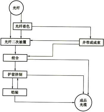 将光纤单元与加强件(含填充材料)绞合成缆芯或光缆的工艺。