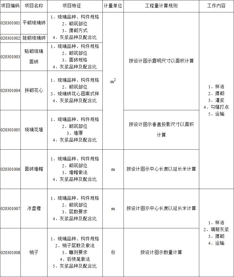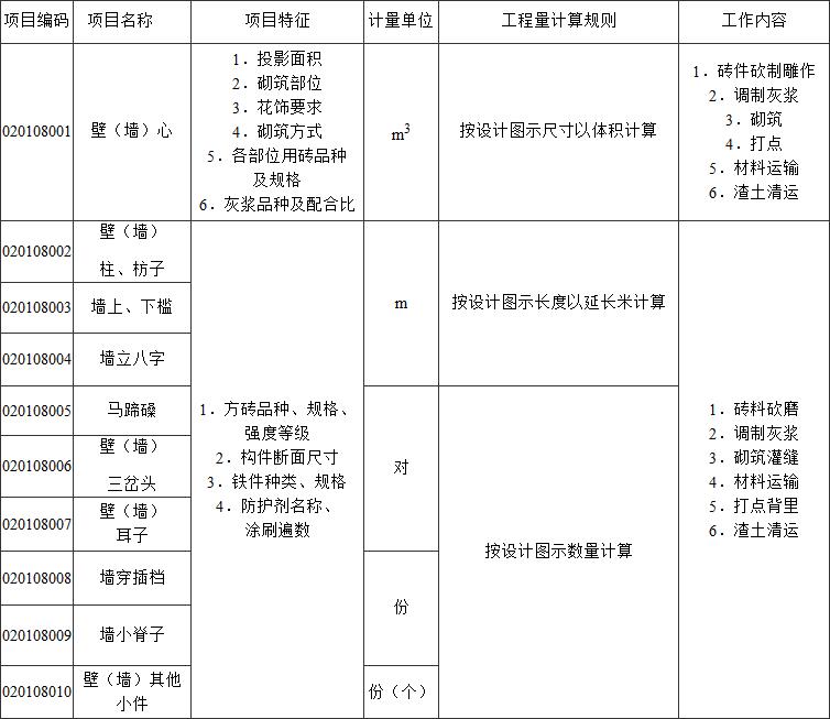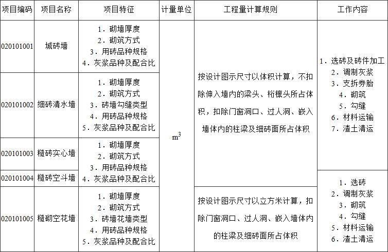 砌砖墙工程量清单项目设置、项目特征描述的内容、计量单位及工程量计算规则,应按表A.1的规定执行。