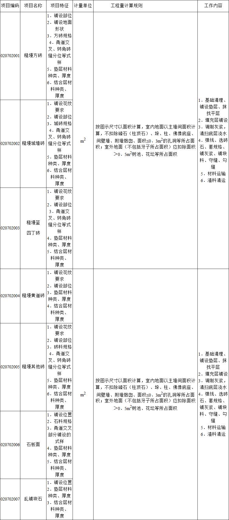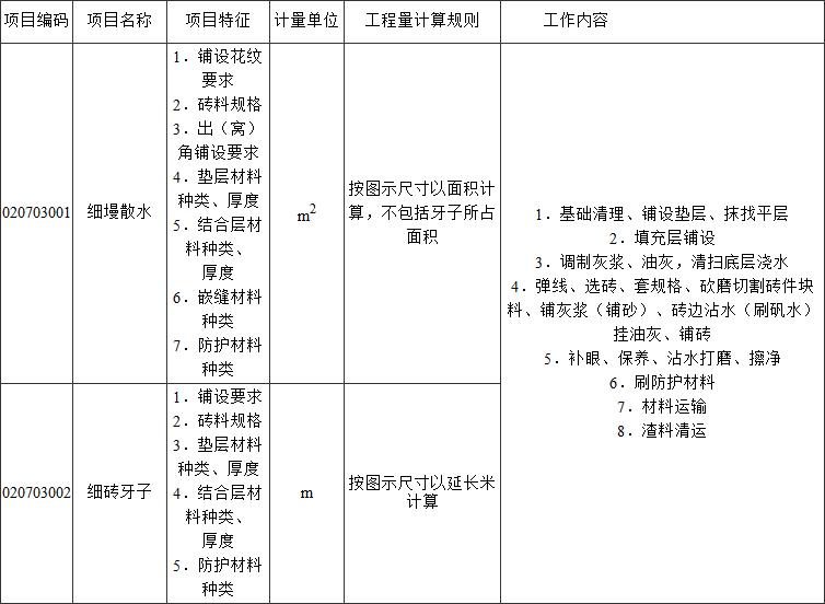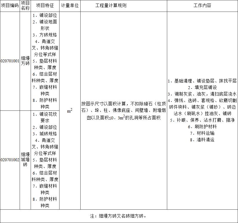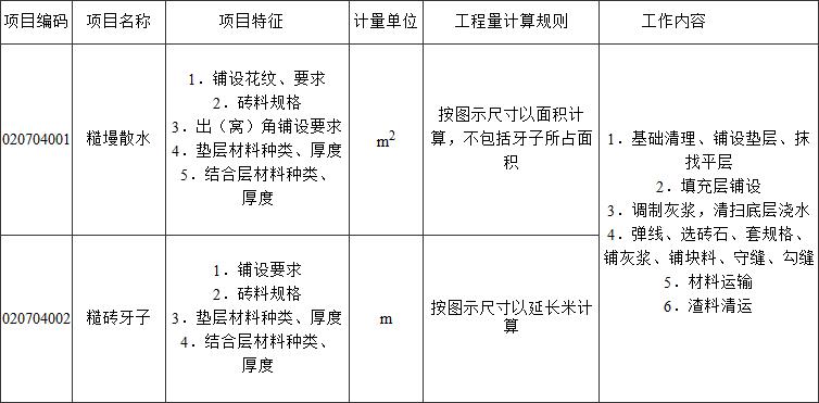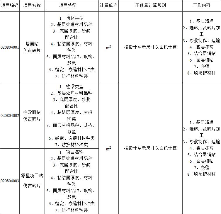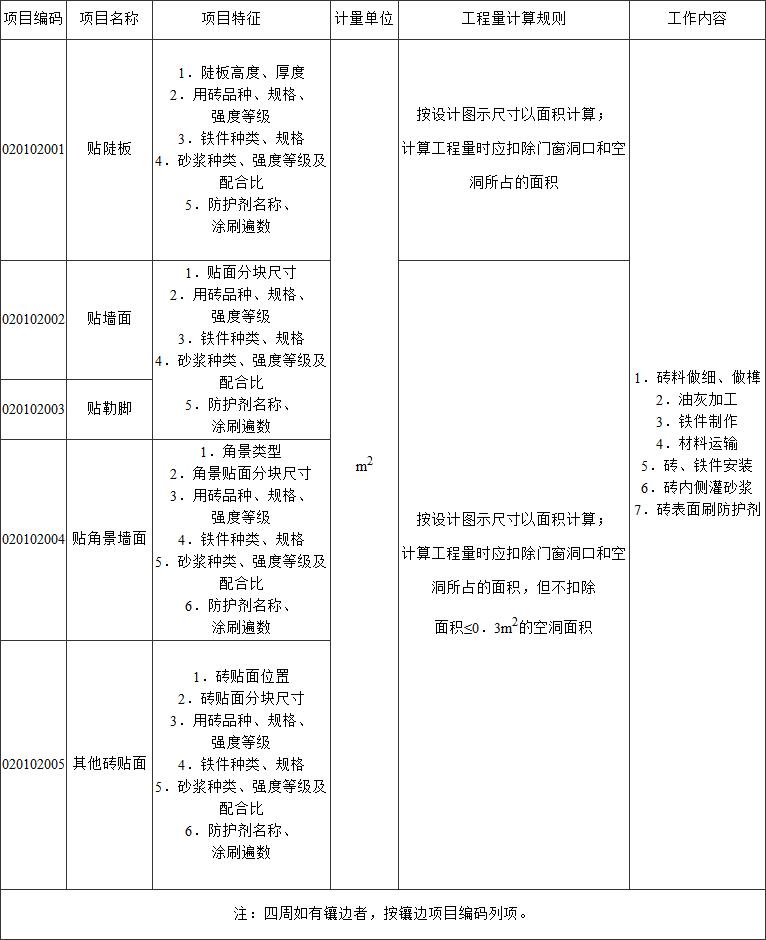 贴砖工程量清单项目设置、项目特征描述的内容、计量单位及工程量计算规则,应按表A.2的规定执行。
