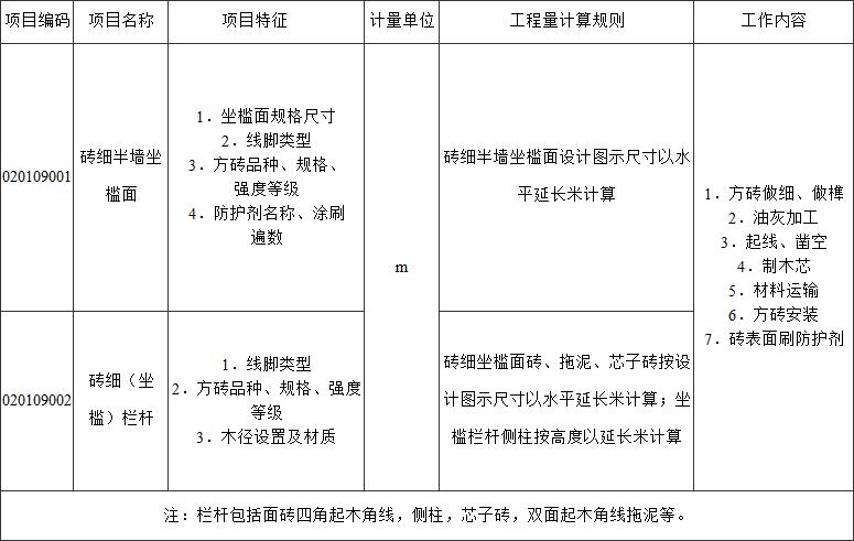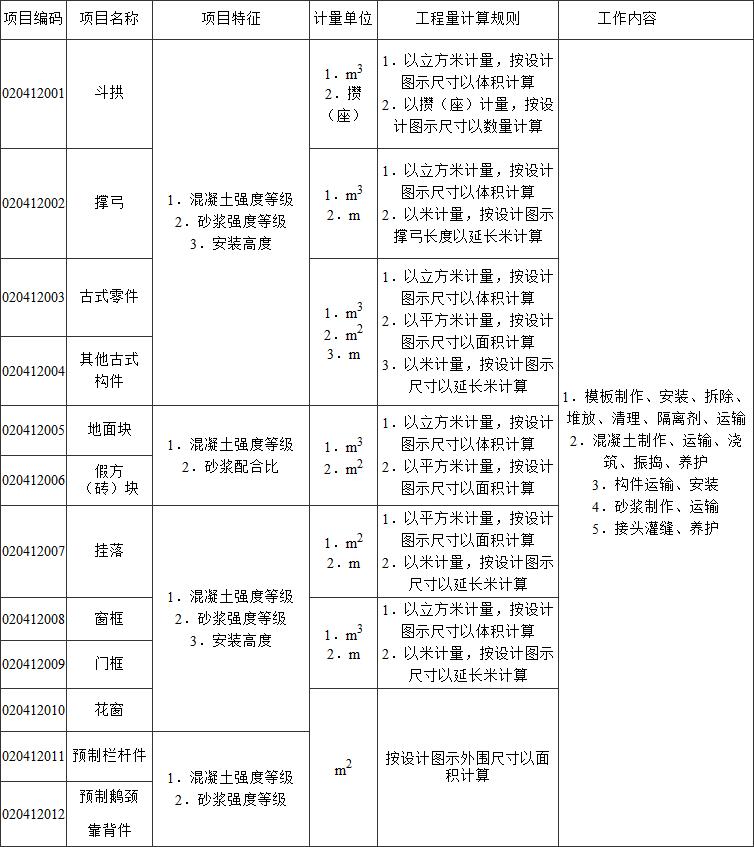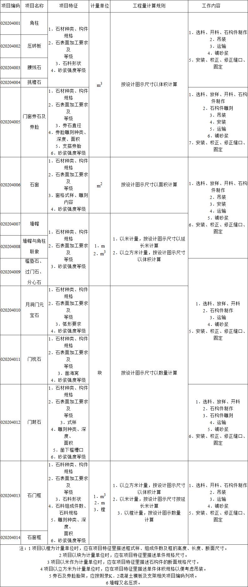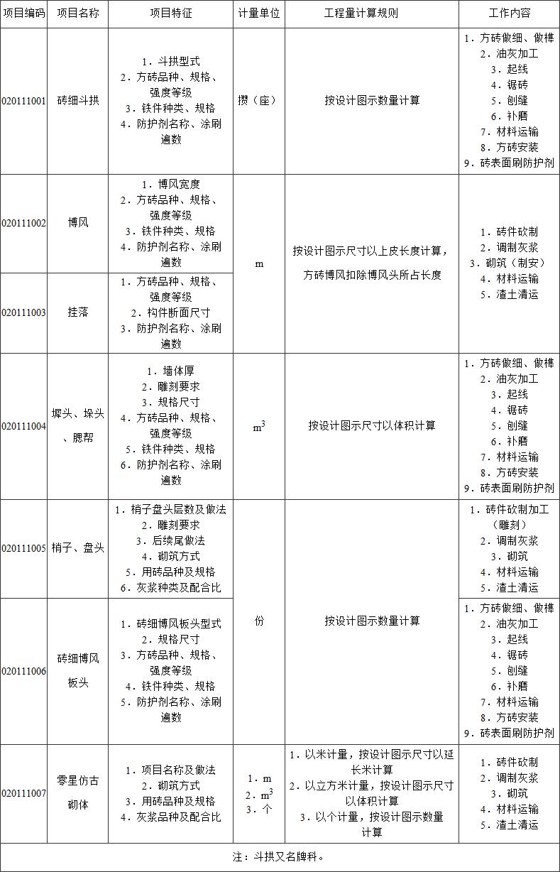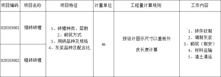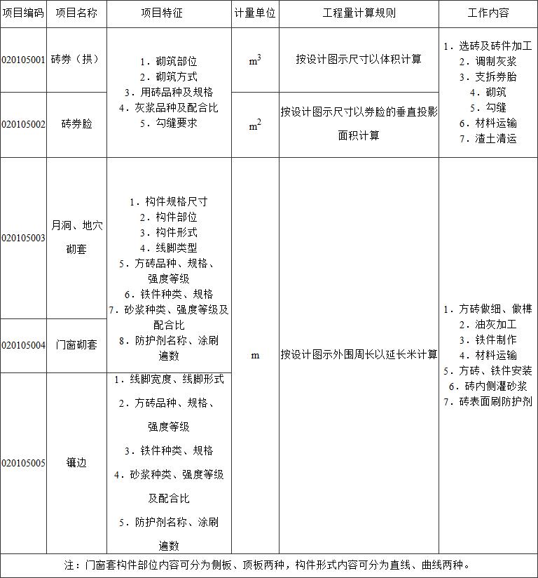 砖券(拱)、月洞、地穴及门窗套工程量清单项目设置、项目特征描述的内容、计量单位及工程量计算规则,应按表A.5的规定执行。
