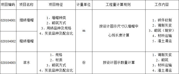 墙帽工程量清单项目设置、项目特征描述的内容、计量单位及工程量计算规则,应按表A.4的规定执行。