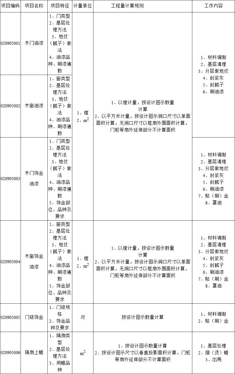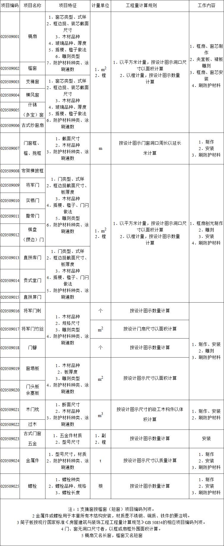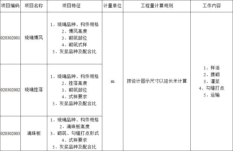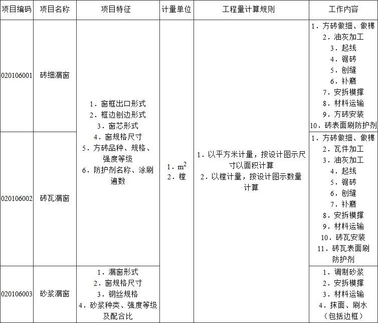 漏窗工程量清单项目设置、项目特征描述的内容、计量单位及工程量计算规则,应按表A.6的规定执行。