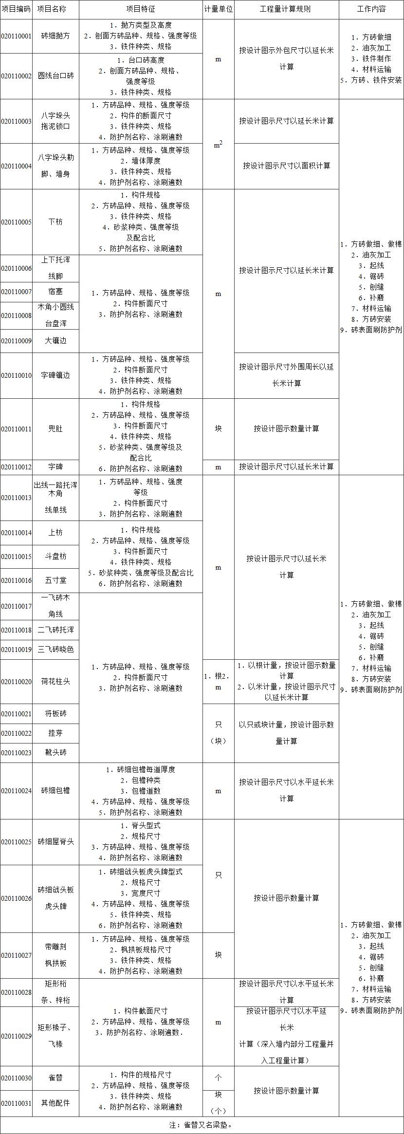 砖檐工程量清单项目设置、项目特征描述的内容、计量单位及工程量计算规则,应按表A.3的规定执行。