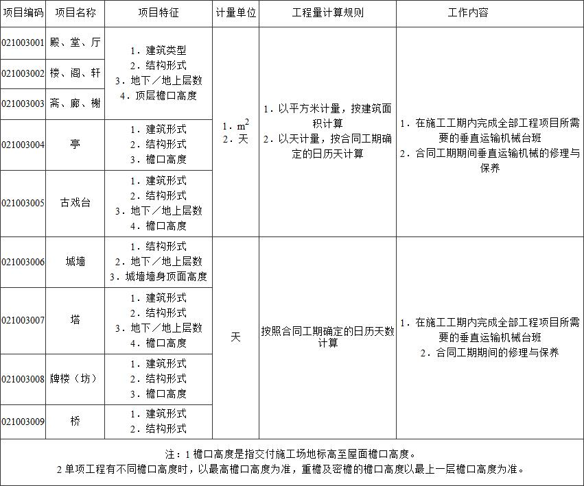 垂直运输工程量清单项目设置、项目特征描述的内容、计量单位及工程量计算规则,应按表K.3的规定执行。