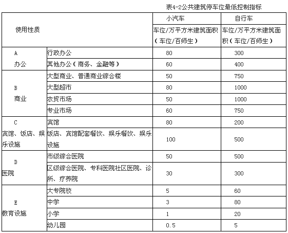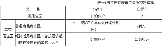 根据城市交通发展的趋势,本着“适当超前,留有余地”的要求,对建设项目(居住建筑及公共建筑)应同步配套建设停车场,面积指标按表4-1、表4-2要求控制: