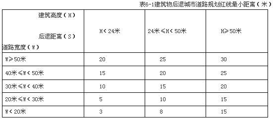 6.1 建筑退让城市道路规划红线距离的规定。为保证建筑地下基础或地下室的施工不致影响城市道路各类管线的安全运营,保持建筑物人流和车辆的出入、集散不影响城市道路交通通畅,并形成开敞的城市空间环境,沿城市道路建筑应按道路功能、路幅宽度以及建筑物类别、高度、体量,确定其后退道路红线的距离,最小后退距离按表6-1控制。