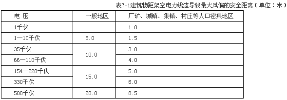7.1 建筑退让电力线路距离的规定。为保证电力线运营安全和建筑物的使用安全,新建建筑物应根据电力规范要求距离退让电力线路,形成电力线路保护区,不允许在电力线路保护区内新建建筑物、构筑物。