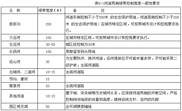 9.3 滨河绿化绿线管理。发挥河道及滨河绿化的生态调节功能,为城市居民提供良好的休闲、娱乐场所。充分利用和保护市区内的水系,建设滨河绿化带。城市道路与河道相邻的,原则上城市道路与河流之间规划为滨河绿地。重点建设古运河和京杭大运河两岸滨河绿带,形成贯穿城市南北绿色走廊,因地制宜沿玉带河、蒿草河、念泗河、赵家支沟、护城河、漕河、邗沟河、仪扬河等城市主要河流建设滨河绿地。分为10-30、30-50、50-100米三个等级控制,具体要求见表9-1: