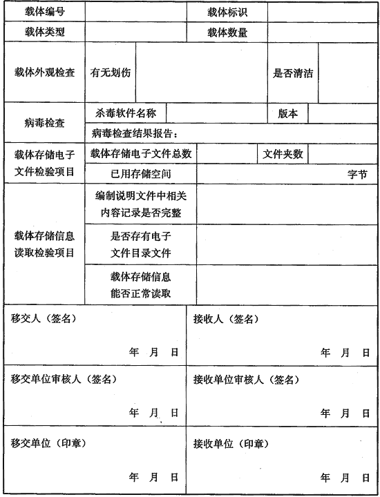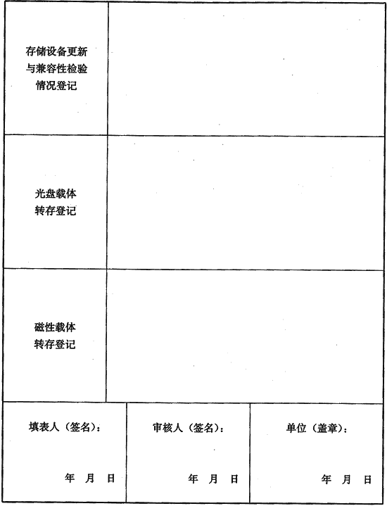 8.2.3 应根据载体的寿命,定期对磁性载体、光盘载体等载体的建设电子档案进行转存。转存时必须进行登记,登记内容应按本规范附录F的要求填写。