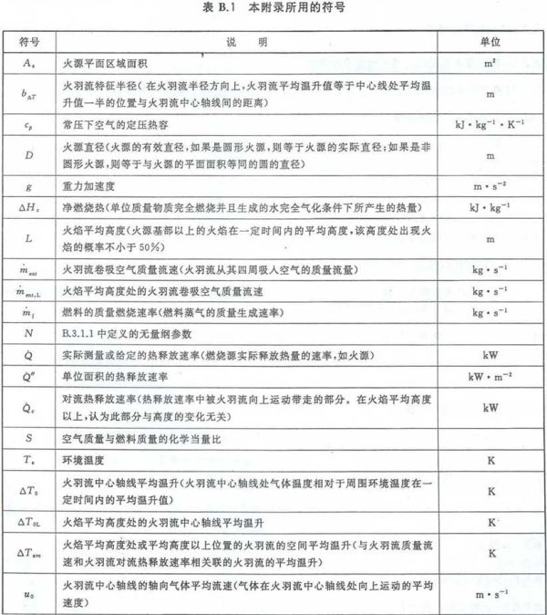 对于火羽流,计算公式可用于估算火焰的尺寸,从而计算出火源与被保护目标之间的安全距离。火羽流计算公式还可用来估算存放有可燃物质的建筑工程内的火焰传播速率,包括水平传播和垂直传播。本部分的附录B给出了准稳态且轴对称火羽流计算公式的应用示例。