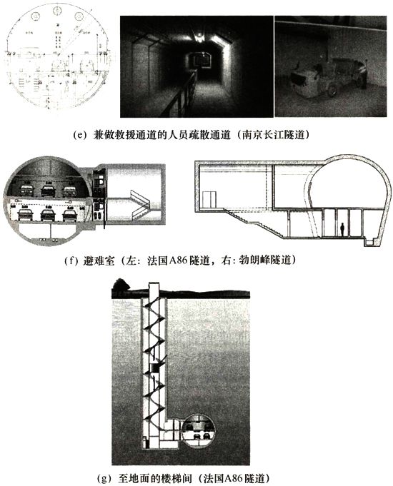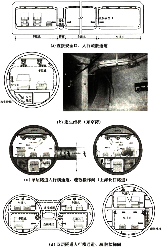 8.3.5 本条参照了《建筑设计防火规范》GB 50016-2006第12.1.7条。地下道路应设置相应安全疏散设施用于应急情况下的人员逃生疏散。安全疏散是指从一个车道孔疏散至另一个车道孔或安全通道。城市地下道路安全疏散设施包括:横向人行通道(或直接安全口)、人行疏散通道(安全通道)、逃生滑梯、上下层楼梯、至地面楼梯及避难室等。安全疏散设施也可兼做救援使用,兼用时应满足救援车辆的尺寸要求,人行区与车行区宜设置分隔措施。另外有条件情况下还可能设置消防电梯等其他救援设施,图14给出了国内外常用的几种典型安全疏散设施设置方式。