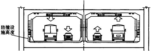 7.4.1 城市地下道路一般不设置检修道,内侧车道行驶的车辆与侧墙的侧向距离较小,为防止车辆失控直接与碰撞侧墙,避免对结构造成破坏。同时,侧墙内部都一般布设运营所必需的设备系统,车辆直接碰撞侧墙后也会对内部设备系统造成损害。因此,城市地下道路必须设置防护设施,避免失控车辆与侧墙直接碰撞。从应用来看,当前城市地下道路两侧大多采用混凝土防撞侧石作为防撞设施,具体设置标准可参考国家现行标准。