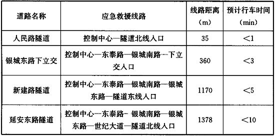 集中布置的运营管理中心应该能同时满足多条地下道路的总体监控功能、运营管理以及可靠性要求,还应综合考虑与各地下道路的距离,将救援线路长度和救援时间控制在合理范围内,能够满足迅速应急救援要求。人民路地下道路群运营管理中心为例,采用“五房合一”,管理人民路隧道、银城东路下立交、新建路隧道、延安东路隧道、东西通道共5条地下道路,其中东西通道尚处于设计阶段,合并的运营管理中心与其所监控的各地下道路距离以及应急救援路线,见表18。实践运营表明合并运营管理中心,集中管理,对精简机构,减少人员,节约建设用地,降低运营成本具有重要作用。