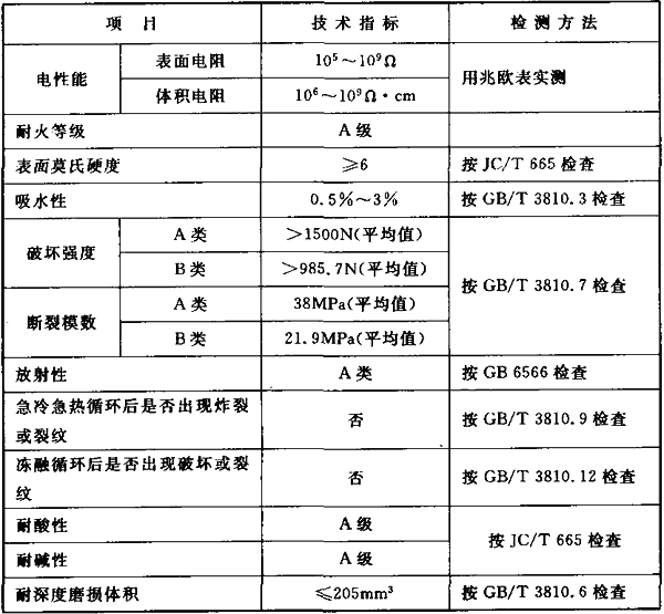 3.2.4 本规程规定的主要技术指标,按照现行行业标准《电子产品制造防静电系统测试方法》SJ/T 10694、《瓷质砖》JC/T 655和现行国家标准《陶瓷砖试验方法 第3部分:吸水率、显气孔率、表观相对密度和容重的测定》GB/T 3810.3、《陶瓷砖试验方法 第6部分:无釉砖耐磨深度的测定》GB/T 3801.6、《陶瓷砖实验方法 第9部分:抗热震性的测定》GB/T 3810.9、《陶瓷砖实验方法 第12部分:抗冻性的测定》GB/T 3810.12、《陶瓷砖实验方法 第7部分:有釉砖表面耐磨性的测定》GB/T 3810.7、《建筑材料放射性核素限量》GB 6566的规定测定。