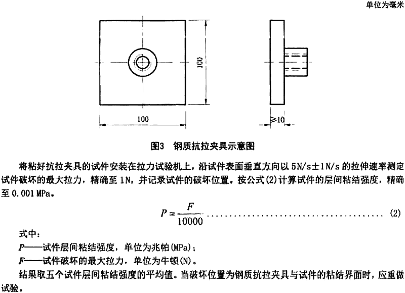 试件应在温度为40℃±2℃的电热鼓风干燥箱中烘干至恒重(24h的质量变化率小于0.5%),然后用双组份环氧树脂均匀涂布于试件的两个表面,分别将钢质抗拉夹具(见图3)牢固粘结于试件的两个表面,待夹具与试件间不会滑动后,一起放入40℃±2℃的电热鼓风干燥箱中,干燥24h后取出,在标准试验条件下放置2h,然后进行拉伸试验。