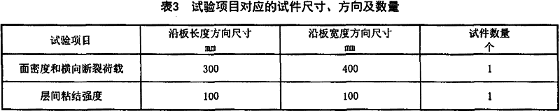 6.3.1 以5张板材为一组试样,依次进行外观质量、尺寸和尺寸偏差检测后,在距板材四周不小于100mm处切取面密度、横向断裂荷载、层间粘结强度试验用的试件,每张板上切取试件的尺寸、方向及数量按表3的规定。