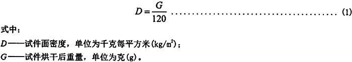 试件应在温度为40℃±2℃的电热鼓风干燥箱中烘干至恒重(24h的质量变化率小于0.5%),然后用电子秤称重,精确至1g。按公式(1)计算试件的面密度,精确至0.1kg/m2。结果取五个试件面密度的算术平均值。