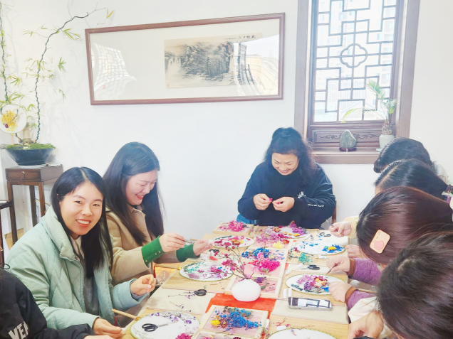 在实践环节,女职工们化身“非遗手艺人”,以素面团扇为底,干花为面,创作出风格各异的特色作品。选择团扇制作,既是对非遗文化的传承实践,也借“圆扇”寓意女职工凝心聚力、团结奋进的团队精神。活动尾声,女职工们手持20余柄风格各异的团扇合影,古典韵味与现代职场风采相映生辉。