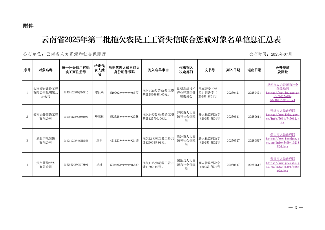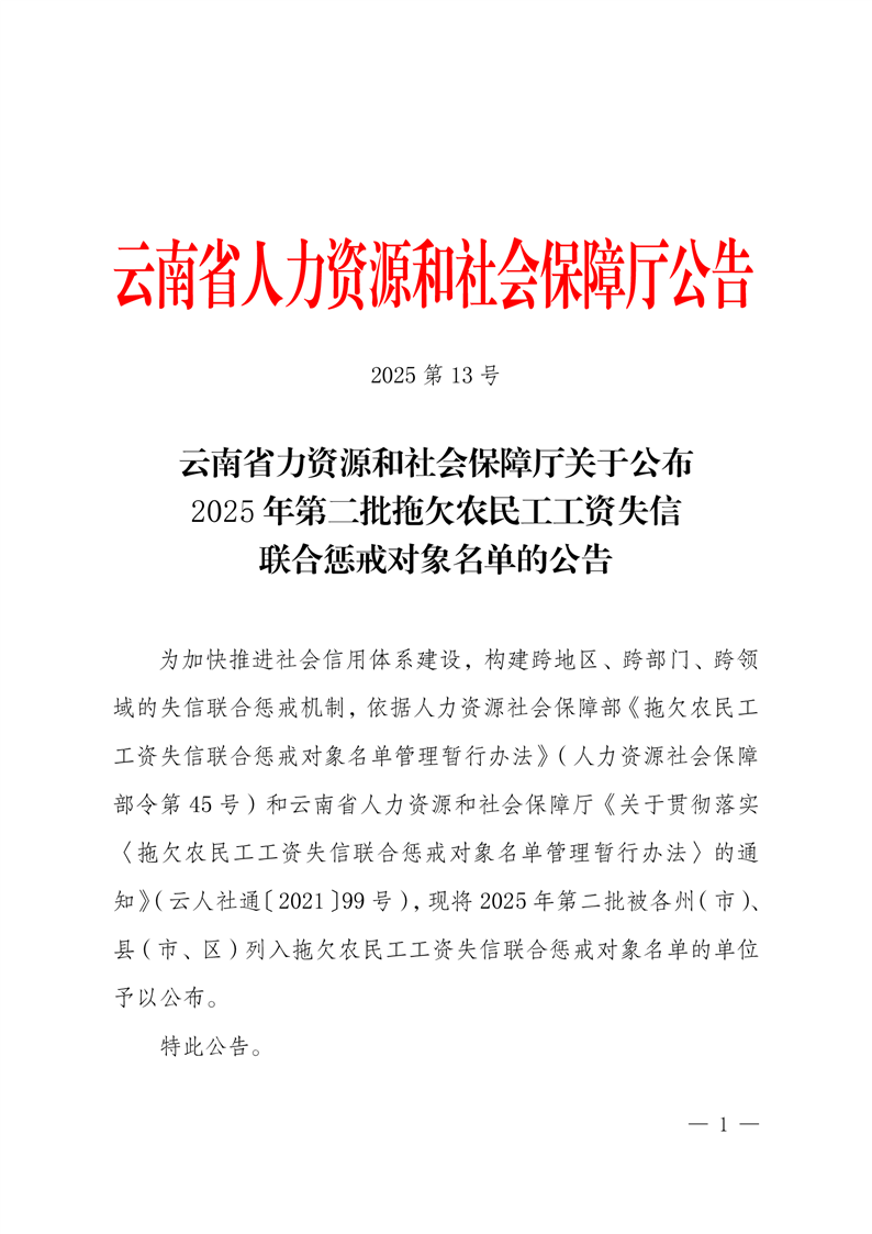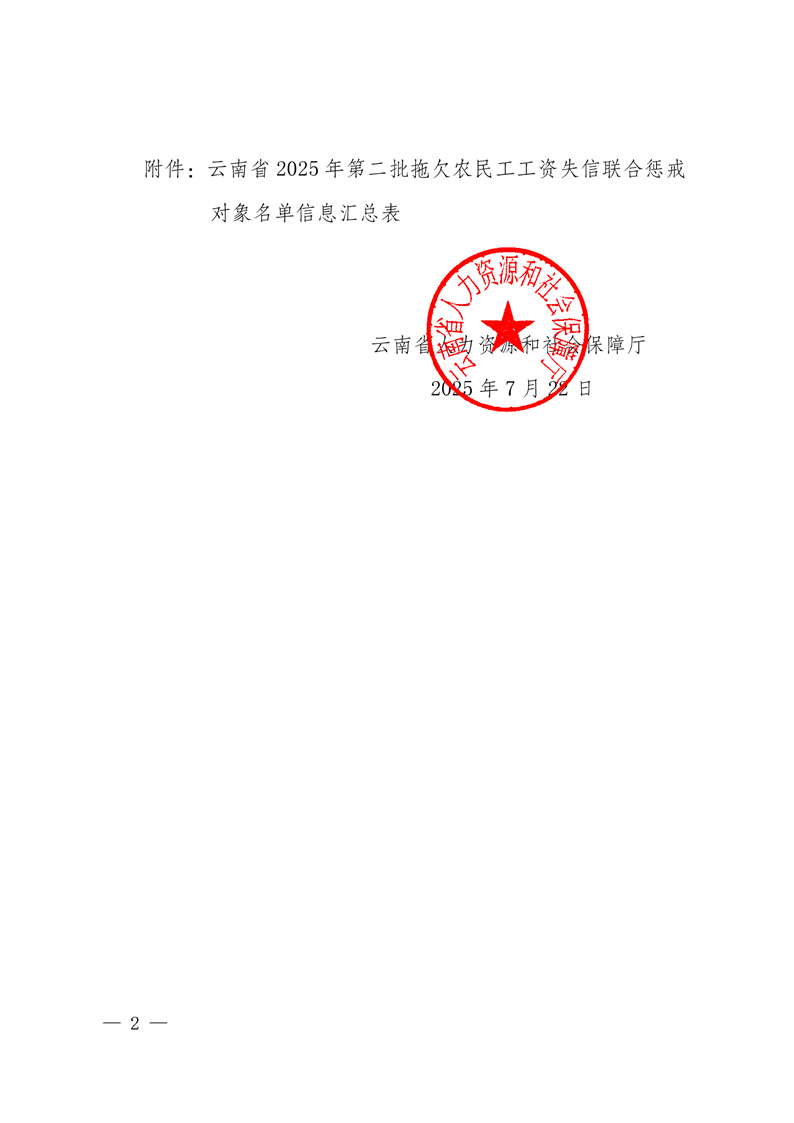 云南省力资源和社会保障厅关于公布2025年第二批拖欠农民工工资失信联合惩戒对象名单的公告
