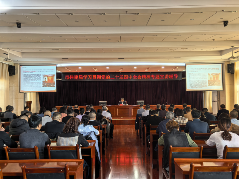11月28日,市住建局召开党组理论学习中心组(扩大)会议暨学习贯彻党的二十届四中全会精神专题宣讲辅导会,局党组书记、局长徐晓围绕“深入学习贯彻党的二十届四中全会精神,努力推动全市住房城乡建设事业高质量发展”作专题宣讲辅导,市住建局全体领导干部职工参加会议。